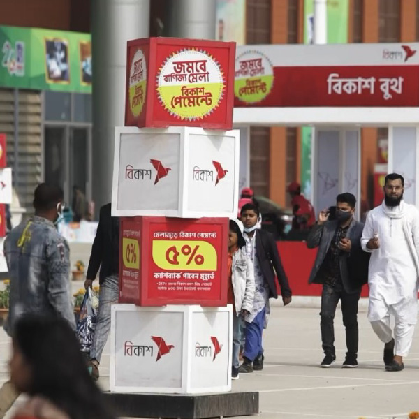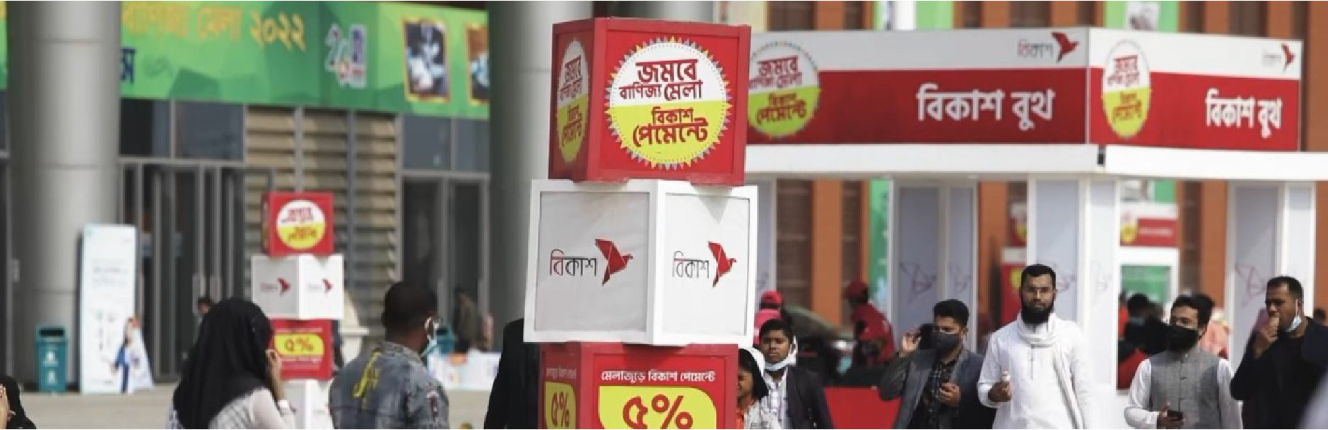 bKash is leading MFS of Bangladesh. Each year they participate in DITF to promote their offers and services. This year their objective was to promote bKash payment in DITF. To support the payment drive DITF bus ticket payment, entry ticket payment, parking ticket payment, account opening, app registration, cash in cash out and all other bKash services were offered. Besides, to engage customers there were blower game activity, photo booth and seating zone. bKash booths & branding placement in each visible area of the DITF was another KPI of this campaign. bKash brandings were visible throughout every visitors' journey from the very beginning to end